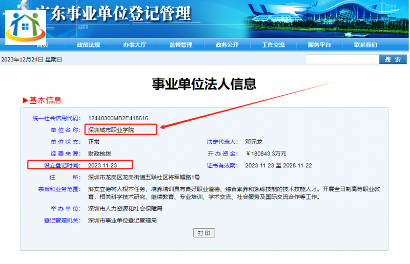 近日,據(jù)廣東省事業(yè)單位登記管理局公開信息顯示,11月23日,深圳城市職業(yè)學(xué)院已設(shè)立登記!