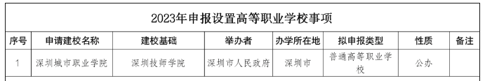 此前,廣東省教育廳發(fā)布《關(guān)于2023年度申報設(shè)置高等職業(yè)學(xué)校事項的公示》,申報以深圳技師學(xué)院為基礎(chǔ)設(shè)立深圳城市職業(yè)學(xué)院。