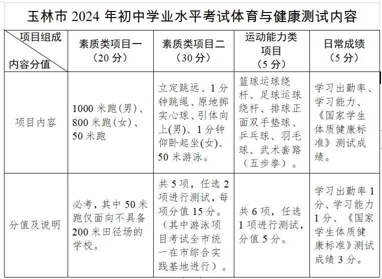 必看!玉林市2024年初中學(xué)業(yè)水平考試(體育中考)測試內(nèi)容