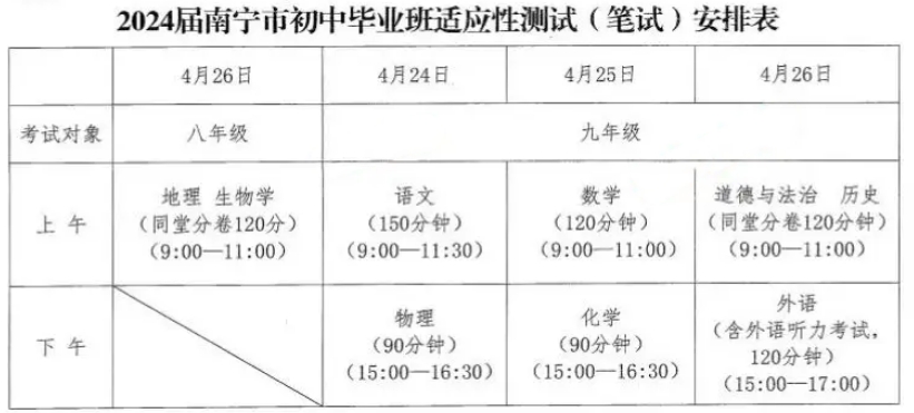 速看!4月24日-26日南寧市2024年中考一??荚嚂r(shí)間