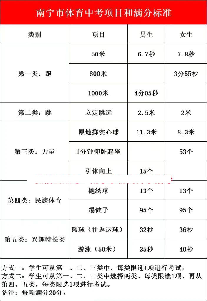 關注!南寧市體育中考項目和滿分標準,廣西初中升學網(wǎng)已經(jīng)為大家整理相關內(nèi)容,希望能對你有所幫助。南寧市體育中考項目和滿分標準