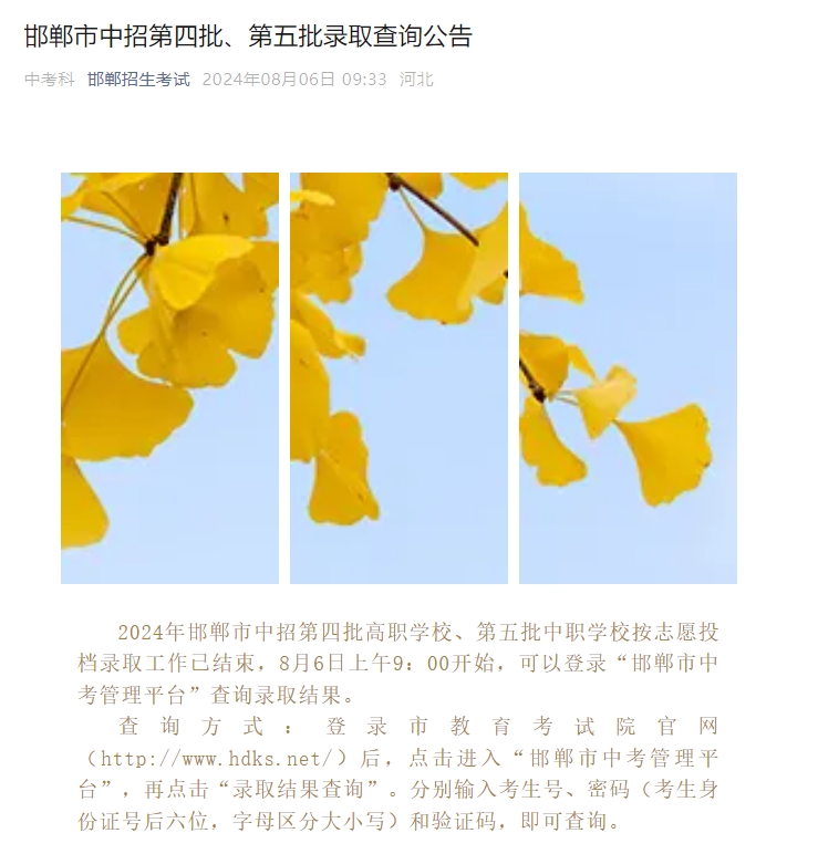 邯鄲市中招第四批、第五批錄取查詢(xún)公告