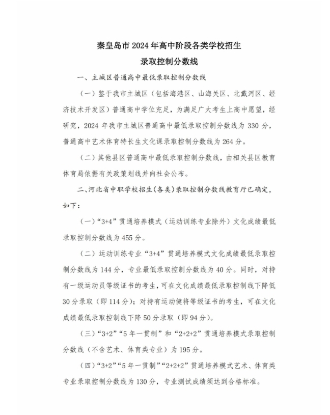 秦皇島市2024年中考錄取控制分?jǐn)?shù)線公布