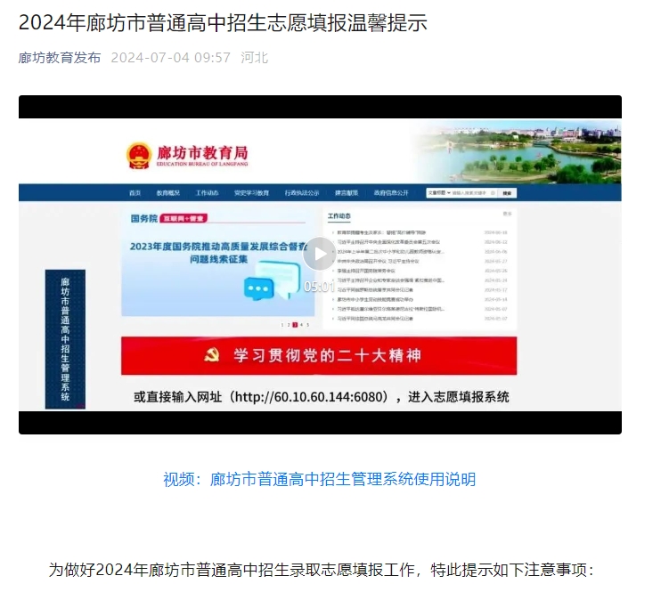 為做好2024年廊坊市普通高中招生錄取志愿填報(bào)工作,特此提示如下注意事項(xiàng):1 本次志愿填報(bào)時(shí)間為7月7日上午9:00—10日中午12:00(24小時(shí)制)