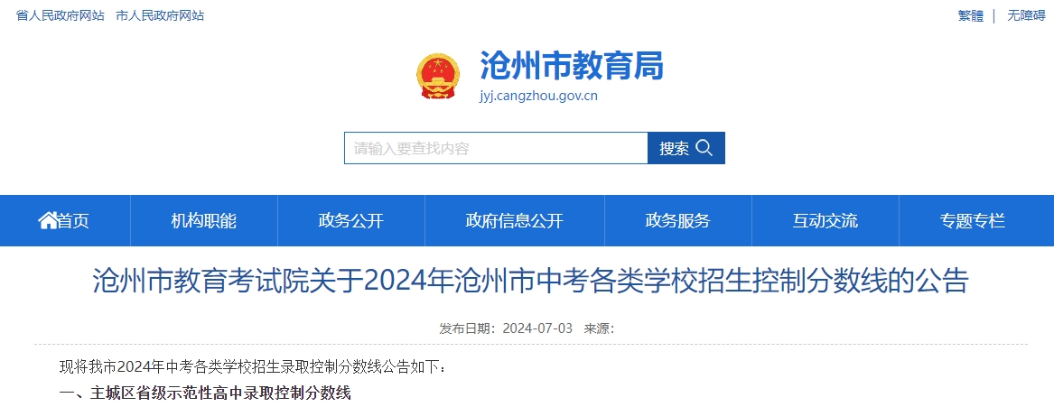 2024年滄州市中考各類學(xué)校招生控制分?jǐn)?shù)線公布!