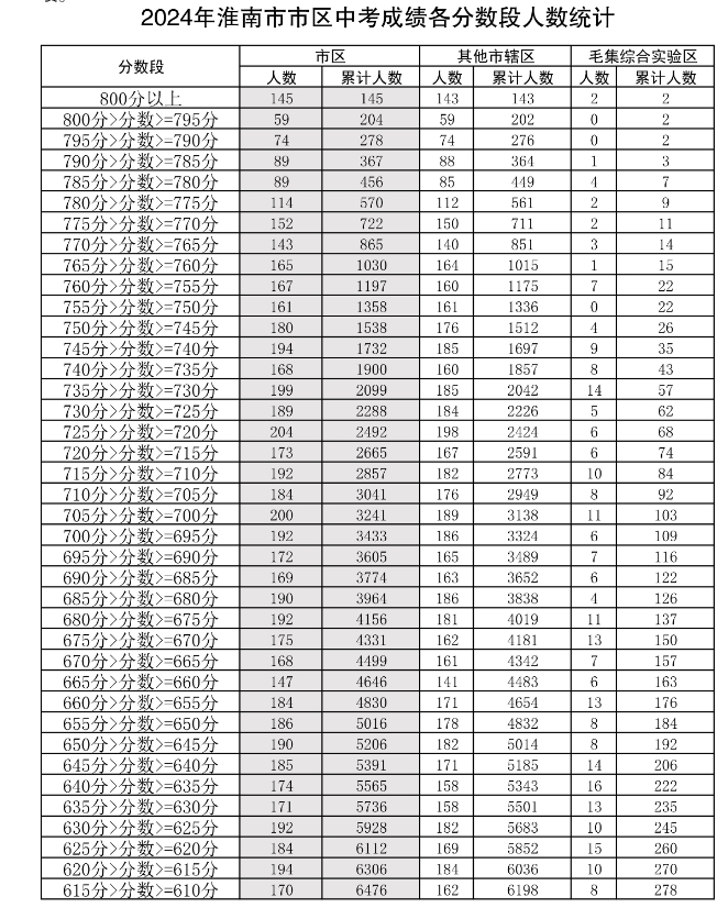 速看!2024年淮南市市區(qū)中考成績各分數(shù)段人數(shù)統(tǒng)計公布