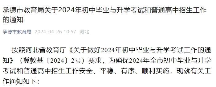 承德市教育局關(guān)于2024年初中畢業(yè)與升學(xué)考試和普通高中招生工作的通知!