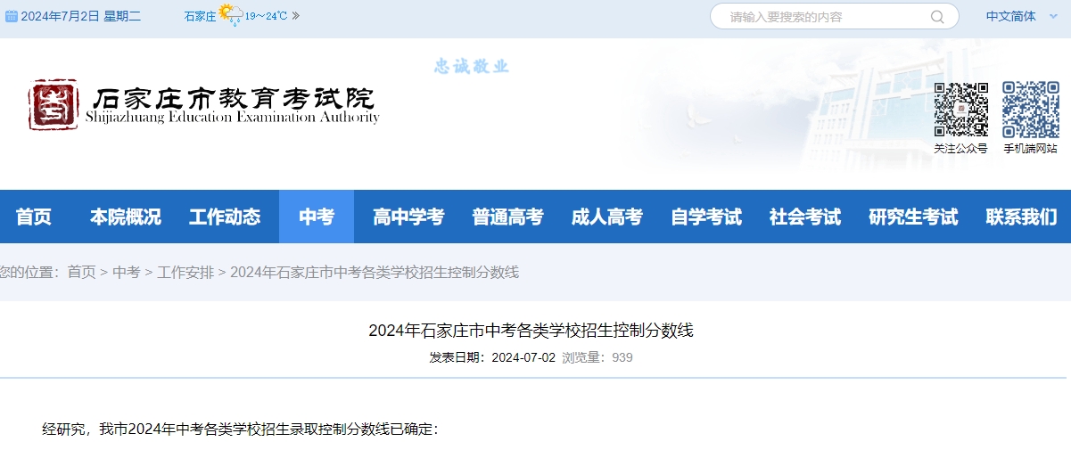 2024年石家莊市中考分數線(含17個縣、市、區(qū))
