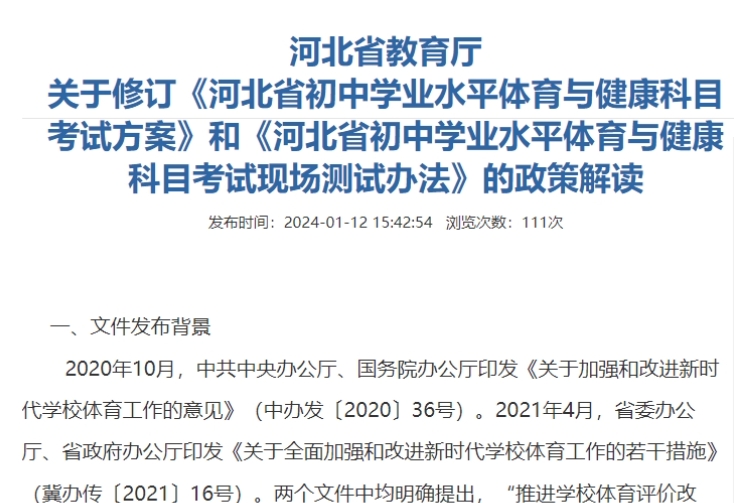 河北省教育廳關(guān)于修訂《河北省初中學(xué)業(yè)水平體育與健康科目考試方案》和《河北省初中學(xué)業(yè)水平體育與健康科目考試現(xiàn)場(chǎng)測(cè)試辦法》的政策解讀