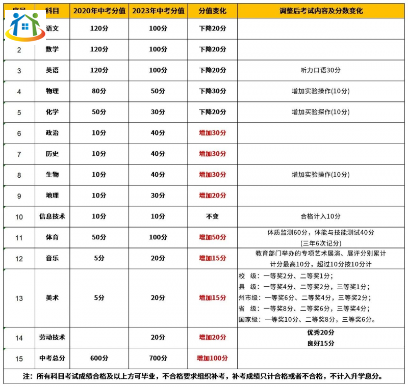 此外,勞動(dòng)技術(shù)屬新增科目:分值為20分,考試方式由各州市自行確定,考試成績(jī)達(dá)到優(yōu)秀、良好、合格者,分別按照20、15、10分計(jì)入高中階段學(xué)校招生錄取總成績(jī),不合格者為零分。