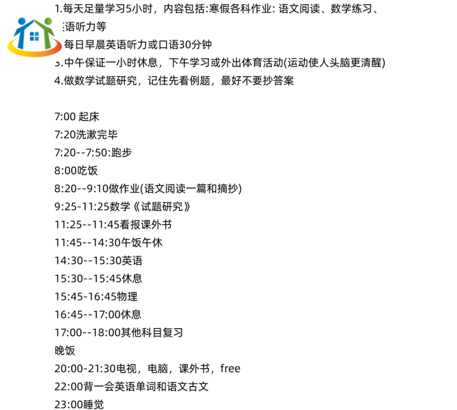 寒假和暑假不一樣,暑假可以直接按照時(shí)間順序來安排學(xué)習(xí)和生活,寒假有一個(gè)盛大的節(jié)日——春節(jié),所以必須按照實(shí)際情況來安排。