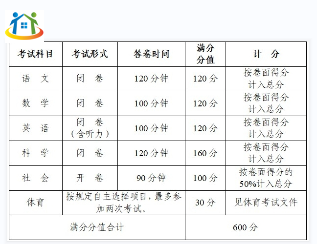 注:上表中考試科目“社會(huì)”即“道德與法治·歷史與社會(huì)”的簡(jiǎn)稱(chēng),其計(jì)分如有0.5分的計(jì)為1分。體育科目得分之和(總分)如有0.5分的計(jì)為1分。