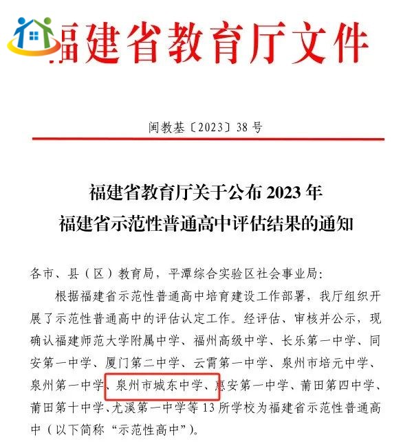 2024年1月3日,福建省教育廳公布2023 年福建省示范性高中建設(shè)評(píng)估結(jié)果,確認(rèn)13所學(xué)校高中部為福建省示范性普通高中,我校泉州市城東中學(xué)赫然在列,這是城東中學(xué)五十多年辦學(xué)歷史上的又一重要里程碑。