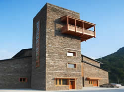 耿達(dá)一貫制學(xué)校建筑方案選擇“被動(dòng)”地去表達(dá)這種“風(fēng)土”。片石壘砌,木柵為窗,在主入口結(jié)合豎向交通設(shè)計(jì)了“碉樓”,成為校園空間的標(biāo)志物。外墻采用石材飾面的作法也源于看到震區(qū)推積