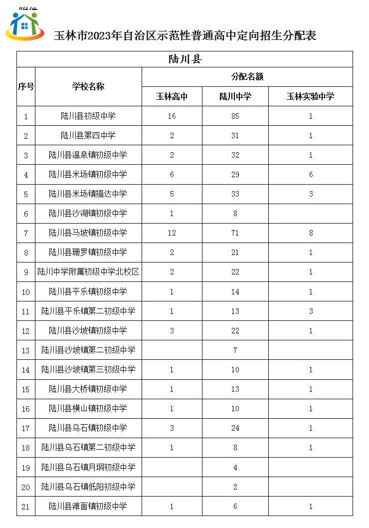 本文標題:初升高必看!陸川縣2023年示范性普通高中招生分配表