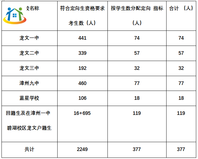 定向生批377人面向在龍文區(qū)內(nèi)中學(xué)就讀并具有定向生資格的所有初中畢業(yè)生,按照《漳州市教育局關(guān)于做好2023年高中階段招生錄取工作的通知》【漳教規(guī)(2023)6號】具體指標(biāo)分配如下: