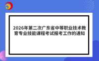 2026年第二次廣東省中等職業(yè)技術教育專業(yè)技能課程考試(以下簡稱“中職技能考試”)將于2026年6月下旬至7月上旬舉行。為做好報考工作,現通知如下: