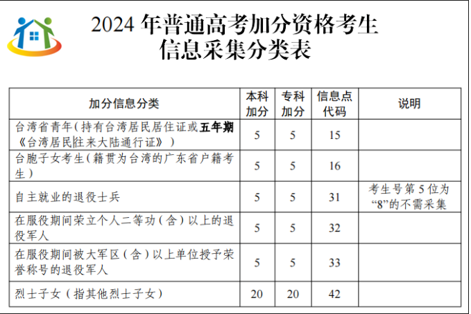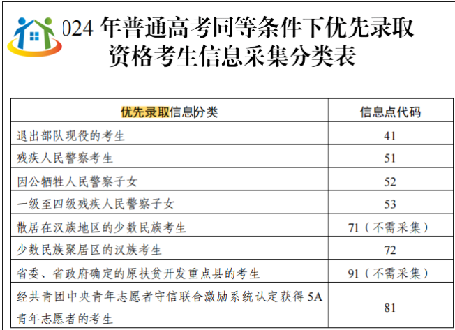 在《2024 年普通高考加分資格考生信息采集分類表》(見附表11)、《2024 年普通高考同等條件下優(yōu)先錄取資格考生信息采集分類表》(見附表12)中,凡信息點(diǎn)代碼欄未注明“不需采集”的加分資格和優(yōu)先錄取資格類型,均在普通高考報名時申報。