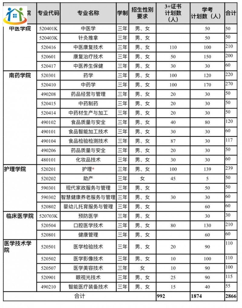 學(xué)校根據(jù)社會對衛(wèi)生健康技術(shù)人才的需求,2024年春季高考招生2866人,其中3+證書(面向中職生)992人,學(xué)考(面向高中生)1874人,各專業(yè)分類招生計劃見表1。