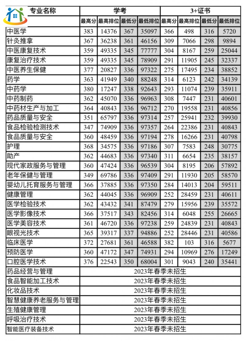 表3 廣東江門中醫(yī)藥職業(yè)學(xué)院2023年春季高考各專業(yè)錄取分?jǐn)?shù)、排位統(tǒng)計