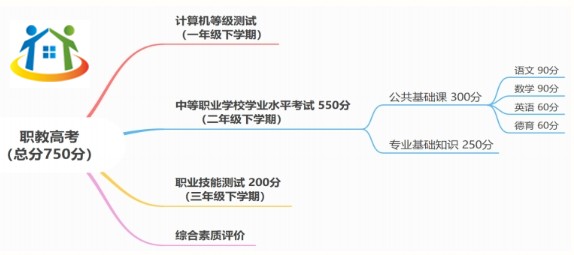 (2)“職教高考”有別于普高生的“夏季高考”,它改變了夏季高考的一考定終身的現(xiàn)狀,通過“兩年兩考”的方式來完成,總分為750分?!皟赡陜煽肌敝付昙壪聦W(xué)期考一次(即“學(xué)考”,安排在每年的6月20日左右),三年級下學(xué)期考一次(即“技能測試”,安排在每年的3月底至4月初)?!皟赡陜煽肌钡某煽兿嗉雍螅凑詹煌瑢I(yè)進行全省排名,作為中職學(xué)生錄取本科及大專院校的主要依據(jù)具體考試科目、時間、分值詳見下表:
