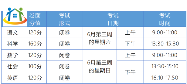 根據(jù)教育部工作部署,結合浙江實際,從2024年起,語文、數(shù)學、英語、科學、社會等5門科目實行省級統(tǒng)一命題,卷面總分值為620分。具體考試科目、卷面分值、考試形式、考試日期、考試時間見下表:
